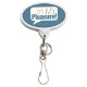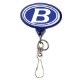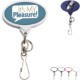 Oval sonic welded plastic body containing bamboo fiber. Anti-twist feature. Chrome finished zinc alloy 360º swivel alligator clip back, extra-long and stronger polished stainless steel internal spring and combo metal swivel “J” hook & mini split ring attachments. Thicker & stronger 24 inch cord.