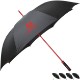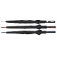Umbrella includes quick access push-button auto-open (manual close), 8 panels covered with 190T Pongee fabric, fiberglass ribs, a 37" metal shaft with rubber handle and tip and a hook-and-loop strap closure.